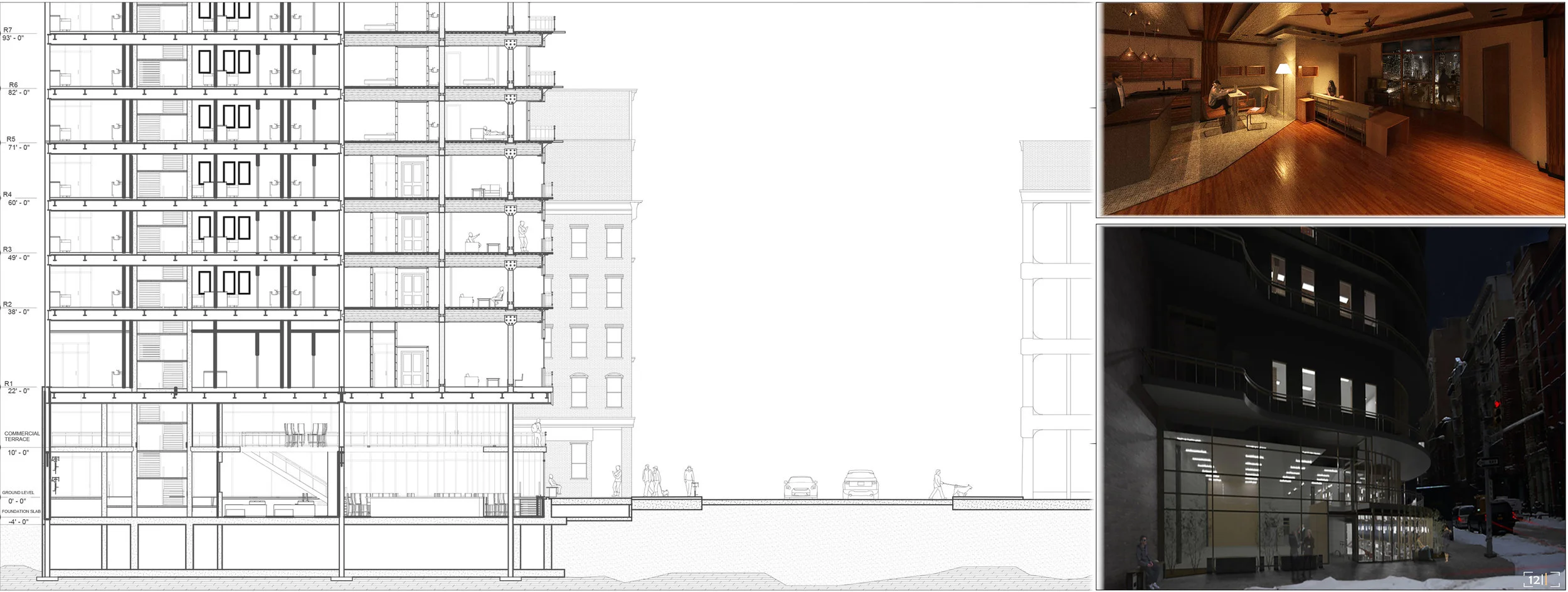 SoHo 21 offers a unique public corner-plaza as an amenity to residents, tourists, & commercial visitors. An amenity rarely seen in the neighborhood. Highly porous commercial space acts to invite patrons into the interior space, while residential functions are separated from the busy streets of SoHo.Inclusive Housing |