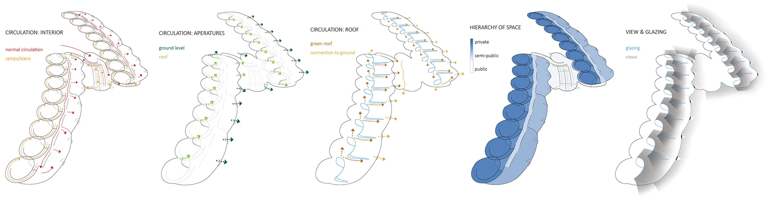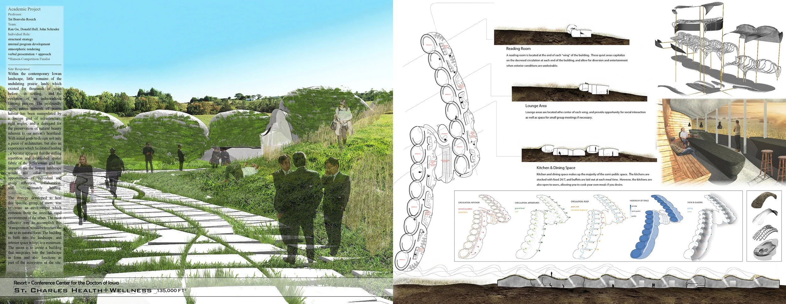 The strategy developed to heal this specific group of users, was to create an environment which contrasts from the stressful, rigid environment of the urban. The most effective way to accomplish this ‘transposition’ would be to return the site to its natural form. The building is built into the landscape, and interior space is kept to a minimum. The intent is to create a building that integrates into the landscape, in a harmonious reconciliation between user & environment.Professor: Tat Bonvehi-Rosich